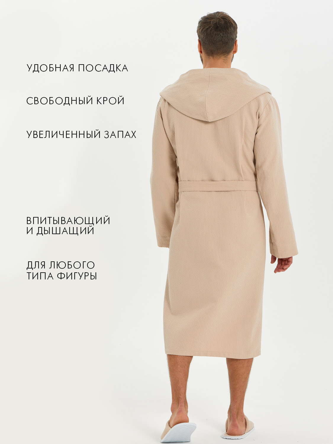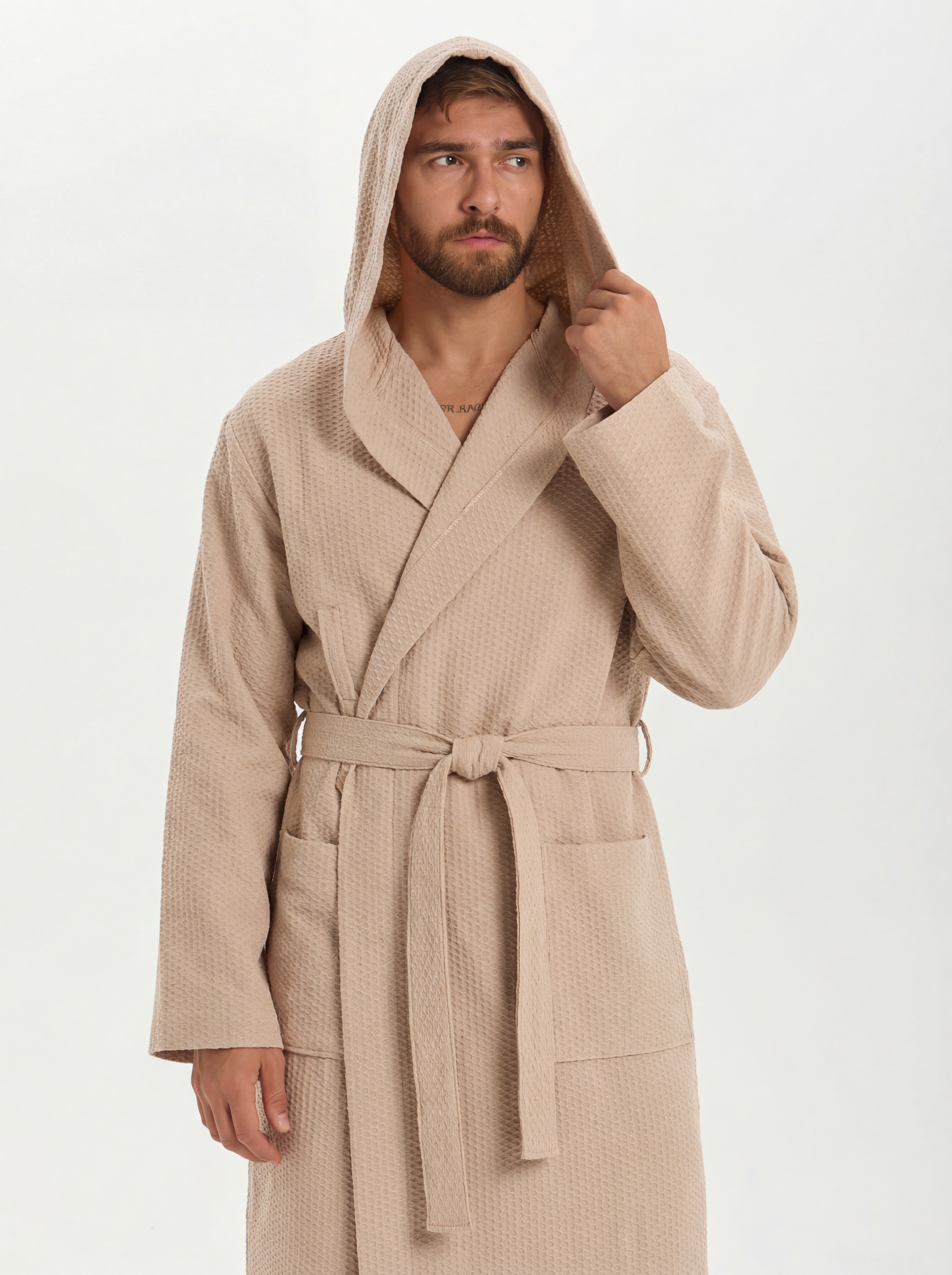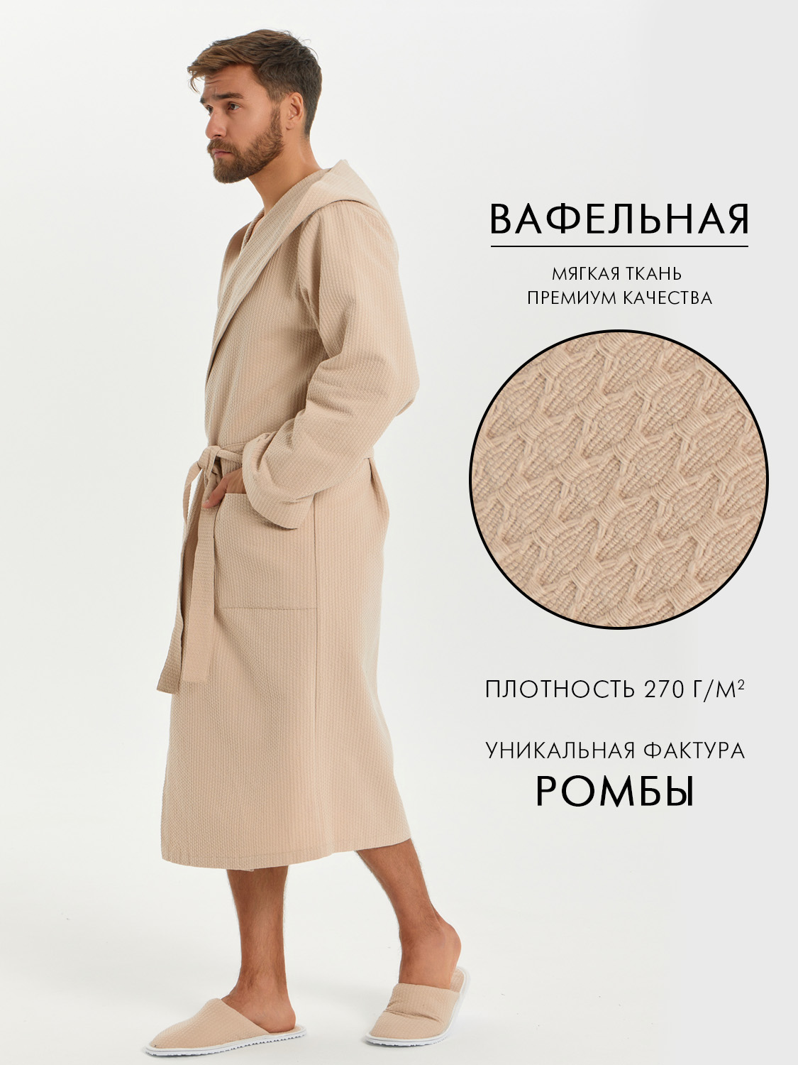Теги: Мужской вафельный халат с капюшоном "Ромбы" бежевый